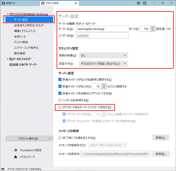 | サーバー設定 | サーバー設定のダウンロード後もサーバーにメッセージを残すを外して下さい。 ここのチェックが入ったままですと、受信サーバーがいづれ満タンになり受信ができなくなってしまいます。 |