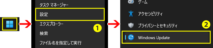 1. 画面左下の「スタートボタン」を右クリック「設定」(①) > 左メニューの 「Windows Update」(②) の順に選択します。