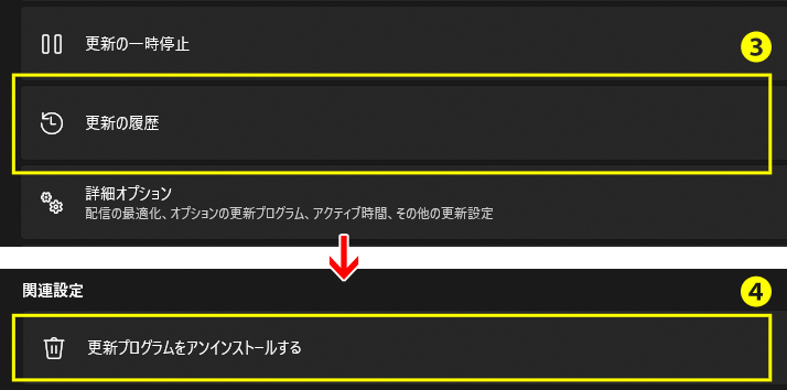 2. 「更新の履歴」(③) をクリックし、画面最下部にある 「更新プログラムをアンインストールする」(④) を選択します。