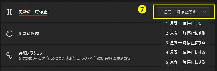 5. 再起動後、再び「Windows Update」画面を開き、「更新の一時停止」(⑦) を設定してください。